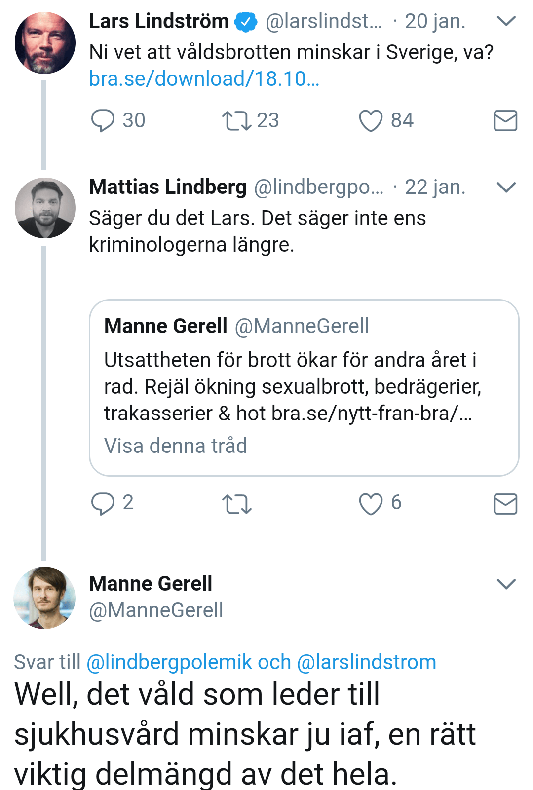 Ett exempel på hur detta används i debatten visas nedan i en konversation med Expressens skribent Lars Lindström och forskaren Manne Gerell (som ändå är mindre ideologiskt låst än de flesta som forskar om brott):